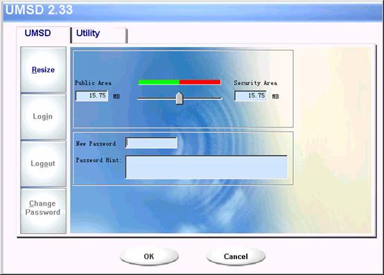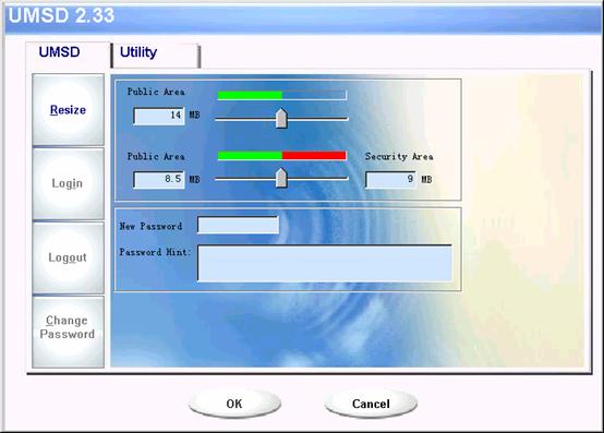 If you select the "Security Area", then the following "Security Area Resize" window will pop up. You can drag the scroll bar in the middle of the window to set the size of the "Public Area" and "Security Area". Or you can type in the size of each Zone you want in the "Size" window. You can set the password for accessing the security area in the "New Password" window. The maximum size of the password is 8 characters. You can key in the hint of your new password in the "Password Hint" window. This hint will be displayed when you click the "Hint" button in the "Unlock Protect" window. The maximum size of the Hint is 32 characters. After you finished the setting, click the [OK] button. The "Confirmation" window will pop up. Please make sure you already backup all the important files or data.