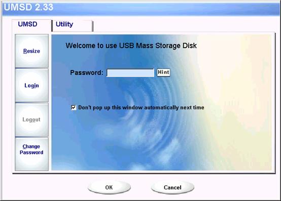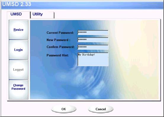 Click the UMSD menu in the notification window using the right button of your mouse and select the [Change Password] selection of the UMSD menu. The following "Change Password" window will pop up.