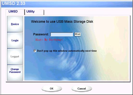 You can create the password hint in the "Resize" or "Change Password" functions. Once you had created the password hint, you can click on the "Hint" button in the "Unlock Protect" window to prevent you forget the password. The Hint will be showed for three seconds.