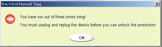 You have three tries to input the password. After three tries, the following message will pop up. And you have to unplug and plug the device in order to do future action.
