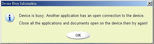 When you do the login or logout action, please make sure you close all the programs or documents open connection on the device. If there is some application program is running or document open connect on the device, the following message will pop up. In Win2000, even the "file manager" has accessed the device it will be treated as "busy". You have to close the file manager in order to do the "Login". However, not all the connection could be checked in all kind of OS.
