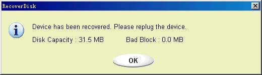 Once your device was damaged, you can use this utility to recover the device. It will make the device back to its initial status. However, if there are some bad blocks in the flash memory, after you run this utility with scan option, its size maybe less than its initial size.
