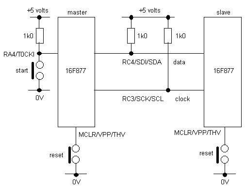 The original intention with I2C is that data are transferred between integrated circuits on the same board, hence the name. In my application communication between boards is required, since the application is modular in nature, and the actual number of boards required for a given implementation is not known at the outset. The flexible nature of I2C is very attractive in that the number of slaves can be varied to suit, with the upper limit of 119 offered by 7-bit addressing well beyond the requirements of any practical implementation using 16F877's at each station .
