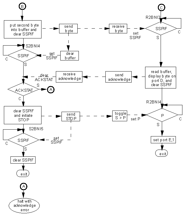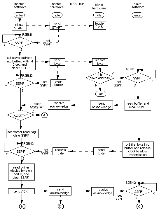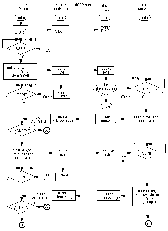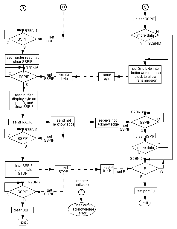 The master software then clears SSPIF and exits. The slave software is waiting on P to be set by slave hardware, and exits when it is so, setting port E,1 to signify the sequence completed.