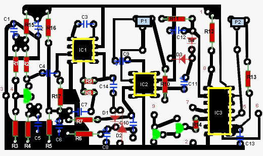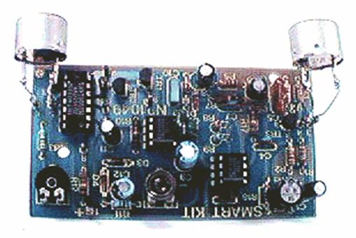 Connect the power supply across points 1 (+) and 2 (-) of the p.c. board and put P1 at roughly its middle position. Turn then P2 slowly till the LED lights when you move your fingers slightly in front of the transducers. If you have a frequency counter then you can make a much more accurate adjustment of the circuit. Connect the frequency counter across the transducer and adjust P2 till the frequency of the oscillator is exactly the same as the resonant frequency of the transducer. Adjust then P1 for maximum sensitivity. Connecting together pins 7 & 8 on the p.c. board will make the circuit to stay triggered till it is manually reset after an alarm. This can be very useful if you want to know that there was an attempt to enter in the place which are protected by the radar.