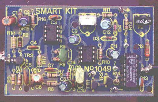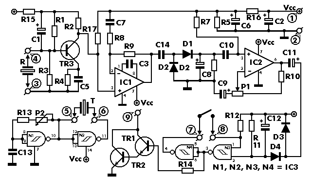 Solder then the transistors and the diodes taking care not to overheat them during soldering. The transducers should be positioned in such a way as they do not affect each other directly because this will reduce the efficiency of the circuit. When you finish soldering, check your work to make sure that you have done everything properly, and then insert the IC's in their sockets paying attention to their correct orientation and handling IC3 with great care as it is of the CMOS type and can be damaged quite easily by static discharges. Do not take it out of its aluminium foil wrapper till it is time to insert it in its socket, ground the board and your body to discharge static electricity and then insert the IC carefully in its socket. In the kit you will find a LED and a resistor of 560 - which will help you to make the necessary adjustments to the circuit. Connect the resistor in series with the LED and then connect them between point 9 of the circuit and the positive supply rail (point 1).