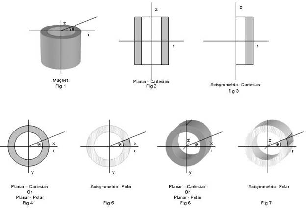 Fig 3 shows the axisymmetric section view. This type of model can be solved for all round air core solenoids and for cylindrical magnet with axial or radial type of magnetization.