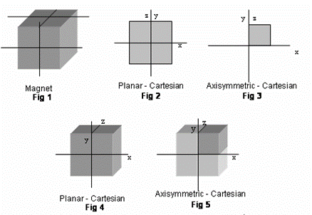 Fig 1 shows a cubical magnet and the way it can be solved is shown in Fig 2 as Planar-Cartesian and Fig 3 as Axisymmetric-Cartesian, while the same can be solved in a 3D-mode, by specifying the depth of the model in the problem as shown in Fig 4 and Fig 5.