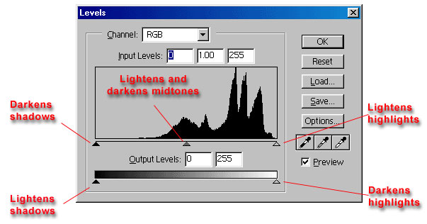 The two dragable triangles below the Output Levels grayscale bar also adjust the image, having almost the opposite affect of the triangles above.