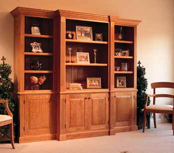 your newly built shelf with Then one day you decide to put encyclopedias on your shelf after you grow weary of the kitties. The shelf sags. The books don't fit under the shelf above, and the books' spines hang over the front edge. And you wish you 12412i822m had used a more rigid material and some sort of adjustable shelf pins so you could change your shelves to fit your needs. Shelves, as you might have guessed, are not as simple as they appear. That's not to say they're hard to build. It's just that there's a whole set of rules to properly design bookshelves or display shelves that ensures they will hold a wide variety of common objects. This shelving unit is the perfect tutorial for etching these rules on your brain. You'll see how I followed the rules to design this project, and you'll get a down-and-dirty lesson in how to build shelving units that are quick, easy, rock solid and good-looking. First, here are a couple rules of thumb when you're putting your design on paper. It's accepted practice to build your cabinets in 3" increments. For example, the side units are 24" wide. If I wanted to make them wider, I'd jump to 27" wide, then 30". Another rule of thumb is that whenever a cabinet gets 42" wide, it needs a vertical support in the center. My cabinets are less than that, so that was no problem for me. Where to Begin: Face First This large wall unit is essentially six plywood boxes with solid wood face frames on front. The part of the back that is visible behind the shelves is solid wood. The back behind the doors is plywood. When building shelves, it's tempting to begin with the case because it goes together really fast. Resist this temptation. Begin your project by building your solid wood face frames. Your entire project is based off your face frame, so if you've got a problem with your design (or how you milled your parts) you're most likely to find out about it when you build the face frame. And I'd rather throw away a skinny piece of solid wood than a sheet of ply. I make my face frames using ¾" material (which is the standard) and mortise-and-tenon construction. First I cut my tenons on the rails, then I use those to lay out my mortises on my stiles. When working with ¾" material, I always make my tenons 3/8" thick and 1" long. Usually I'll cut a ½" shoulder on the width of the tenon, but if the stock is narrow (less than 3") I'll use a ¼" shoulder. I cut my tenons on my table saw using a dado stack. Now lay out your mortises using your tenons. Cut your mortises (I use a hollow chisel mortiser) about 11/16" deep so your tenon won't bottom out in the mortise. Put glue in the mortises, clamp and set your face frames aside. Plywood Boxes Make the cases out of ¾" plywood. Cut ¾" x ¼"-deep dadoes on the sides to hold the bottom pieces. These should be flush to the top edge of the bottom rail. Cut ¾" x ¼" rabbets in the top edge of the side pieces to hold the top. This is also the time to cut the grooves in the sides of the center cabinet to line up all three cases. Read "Another Face Frame Trick" on a previous page for details. Now cut rabbets on the sides to hold the back. The size of the rabbet is determined by whether it's a plywood back or a solid back. Now drill your adjustable shelf holes. I use a commercial jig, but you can make a template yourself from plywood. I drill my holes every 1" or 2" on center, which will allow a lot of adjustment. (The standard is to drill them every 2" on center or less and within 6" of the top and bottom of the cabinet.) For years I used shelf pins that required ¼" holes. Then I switched to metric 5 mm because they're less conspicuous. Now sand the inside of your case pieces with 180 grit sandpaper to knock off the fuzz and splinters. Be careful not to cut through the veneer face. Go ahead and put your cases together. Put glue in the dadoes and rabbets and nail through the outside of the cases into the top and bottom. Putty the nail holes. You don't need to clamp the case. Now attach your face frames using glue and nails. Trim the face frames flush (see "Perfectly Flush Face Frames" on a previous page) and putty your nail holes. Now sand your face frames. I begin with 100 grit, then 120, 150 and finally 180. Sand the outside of the plywood case beginning with 120 grit and work up to 180. If you're going to add columns to your center case, cut the details using a fluting bit in your router and attach the columns to your face frame with glue. Finally, screw all the top units together and then screw all the bottom units together. Then turn your attention to the moulding. Many Mouldings There are five types of moulding: . The crown mould. Buy it pre-made from a hardwood supplier. . The ½" cap on top of the crown mould. This is simply square stock with a 3/8" roundover cut on one edge. . The waist mould. This covers the seams between the upper and lower units. You can buy stuff like this off the rack, or you can make it. First cut your stock to size. Then use a beading bit to cut the center bead. Then use a ½" cove cutter in your router to cut the coves on the top and bottom. Be wary that as you make the second cove cut the moulding won't be as steady. . The base mould. This is flat stock with a ½" cove cut on one edge. . Shelf moulding. This goes on the front edge of the plywood shelves (which you'll make later). I used a rail and stile bit to make this mould in two passes. You also could use a Roman ogee bit and get the same effect. Cut a shallow rabbet on the back as shown in the photo at right. Hand sand all your moulding before applying it. Attach the moulding with glue and nails. Start from the center and work out. One word about the waist mould. Position it so it sticks up ½" above the lower case (see photo at right) and nail it to the lower case. Doors Build the doors the same way you built the face frames with one exception. You'll need to cut a 3/8" x 3/8" groove on the rails and stiles for the solid wood panel. That also