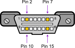 In addition to pins 2, 7, 10, and 15, the connector should have pins 4 (Chassis Ground), 5 (Signal Ground), and 16 (Battery Positive). This means that: