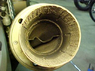 2) Take a hammer and chisel and start driving it into the catalyst about 2-3 inches in. Wiggle and pry it each time you drive it into the catalyst element. After several times you will see that its not very strong. Start chiseling around the edges and working it away from the edge of the pipe. Take out the big pieces as you go. After you get all of the big pieces out use pliers and pull off the remaining pieces of element stuck to the midpipe. (SEE PICTURE)