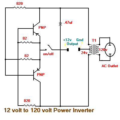 Ever needed a low power 120volt AC power source for your car, van or truck? Well this circuit should do the trick for you. It will supply 15 watts of AC power to a device 17317v2123r . It should power lamps, shavers, small stereos and small appliances. If you draw to much power the circuit will shut down all by itself. The output of this circuit is a square wave so there may be some noticeable hum on audio units plugged into it. To reduce some of the hum increase the value of the output capacitor which is at .47uf now. That transistor in the circuit are high power PNP transistors. Radio Shack part number 276-2025 are good ones to use or TIP32. The transformer is a 24 volt 2 amp center tapped secondary Radio Shack part number 273-1512 or equivalent.