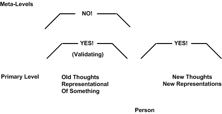 But when I believe in that thought ("I can take criticism effectively"), I move to a higher logical level. Reflexively, my thoughts come back to reflect on my previous thoughts. This puts me at a meta-level to my thoughts-and-feelings about the first level thoughts-and-feelings. They no longer refer to something out there in the world, but to something "in here" in my mind. They refer to a concept about conceptual realities.