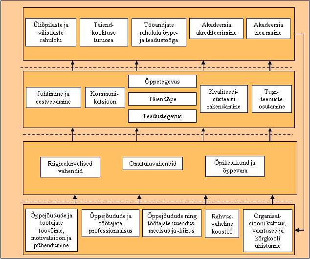 Pidevalt toimivat ja täiustuvat kvaliteedikindlustussüsteemi peaks kõrgkoolid seadma üheks olulisemaks arengu eesmärgiks, et sellest kujuneks kõrgkooli organisatsioonikultuuris oluline komponent. Kultuur ei ole olemuselt ratsionaalne, vaid emotsionaalne nähtus. Kultuuriks muutub organisatsiooni eesmärkide saavutamist soodustav kord siis, kui see on omaks võetud ja seda täidetakse meeleldi(Altmäe 2005:142). Ka kvaliteedisüsteemi väljatöötamine peab väljastpoolt pealesurutud tegevusest muutuma kõrgkooli organisatsioonikultuuri osaks, mis hakkab lõpptulemusena soovitud tulemusi andma.