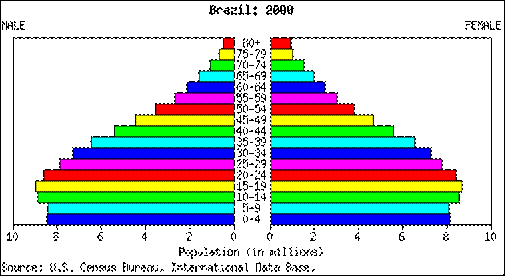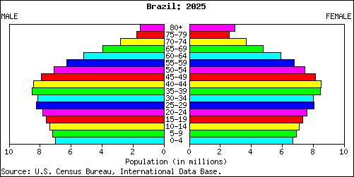 Pyramidit kertovat, että vuonna 2000 Brasilia oli hidastuvan kasvun vaiheessa. 2025 ennuste kertoo, että Brasilia on väestön vähenemisen vaiheessa. Vanhuksia on entistä enemmän ja kuolleisuus kasvaa.