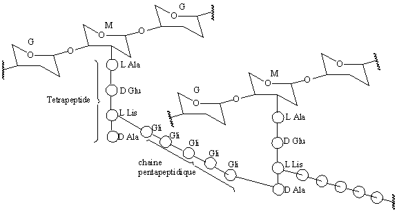 N-acétylmuramique; peptide = chaîne pentapeptidique).