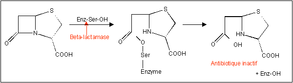 Il s'agit de protéases à sérine active (Enz-Ser-OH), qui se lient aux beta-lactames avec plus d'affinité que les PBP. Comme les PBP, elles hydrolysent la liaison amide du cycle beta-lactame, pour former un acyl enzyme, mais la différence majeure entre les 2 types d'enzymes consiste dans la vitesse avec laquelle l'acylenzyme est hydrolysé. En effet, si les PBP ne sont capables d'hydrolyser qu'une beta-lactame par heure de tel sorte que l'acylenzyme apparaît dans ce cas comme un intermédiaire stable, les beta-lactamases les plus efficaces en hydrolysent 1000 par seconde, rendant l'antibiotique totalement inactif et régénérant l'enzyme pour une nouvelle réaction d'hydrolyse.