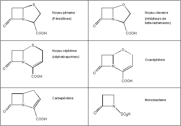 Malgré une structure de base commune (le cycle beta-lactame), on distingue plusieurs familles de beta-lactames en fonction de la nature du cycle accolé (pénicillines, céphalosporines, carbapénèmes, monobactames).