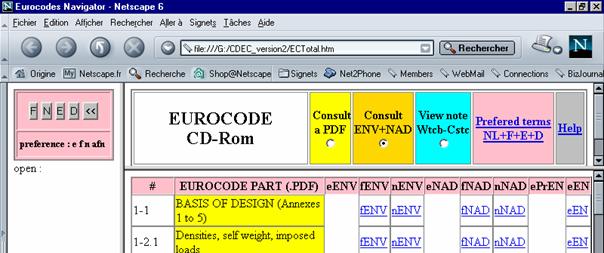 Cliquez sur "starting Eurocode CDle browser contenu sur le CD-Rom (Netscape 6.2) démarrera, et - sauf problème - sera appelé par toute la suite d'écrans successifs. La page de commande principale (ECTotal.htm) apparaît : voir détail ci-après.