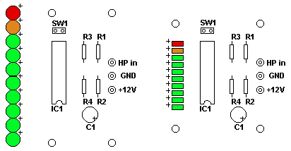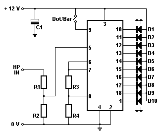 La sensibilité d'entrée du LM3915 (via R3 et R4) est de +/- 10 Volts. Un courant de +/- 15 mA traverse les diodes D1 D10. Un cavalier permet de sélectionner un affichage en mode point ou barre. La consommation globale est de +/- 20 mA en mode point et de +/- 160 mA en mode barre.