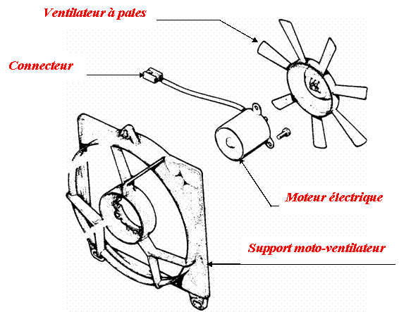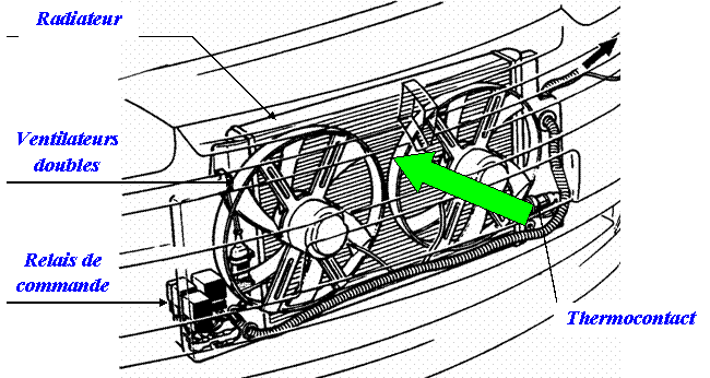 La petite vitesse est obtenue en alimentant le moto-ventilateur au travers d'une résistance disposée en série sur le circuit d'alimentation.