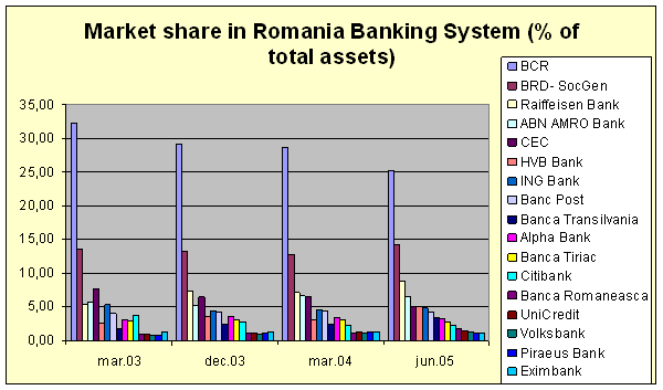 On remarque que le système bancaire est plus privé que toute l'économie roumaine, le poids du capital bancaire privé représentant 70,1% du capital total. A la fin de l'année 2002, le marché bancaire était dominé par trois banques: la BCR, avec une part de marché de 31,5%, la BRD avec 13,66% et la CEC avec 7,71%. Durant l'année 2003, la part de marché de BCR a augmenté dû principalement aux crédits hypothécaires, celles de BRD et de CEC ont connu une baisse, tandis que celles de Raiffeisen Bank, Eximbank, Unicredit Romania, Piraeus Bank et Finansbank Romania ont cru.