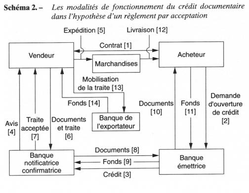 Dans le cadre d'un règlement par acceptation, le schéma général de fonctionnement du crédit documentaire n'est pas fondamentalement modifié à l'exception des phases 6 et 7 (schéma 2). Les points 1 à 5 et 8 à 12 sont identiques à ceux développés dans le cadre d'un paiement à vue. Il est donc inutile de les reprendre. Il surfit d'évoquer les différences.