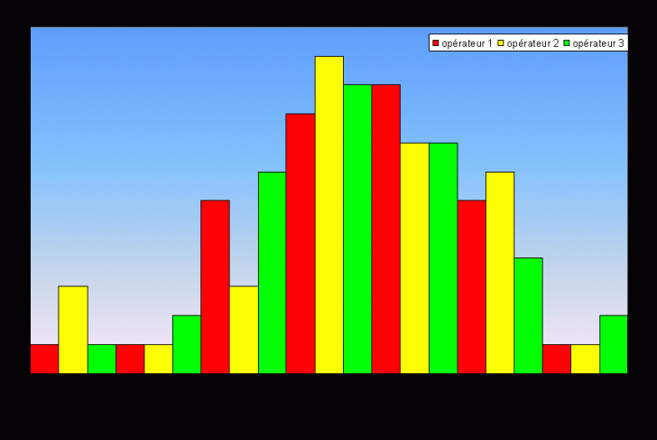 Trois opérateurs vont effectuer chacun les 34 mesures des pièces avec un micromètre électronique, dans le même ordre et en refaisant une mesure étalon ( à 9.99mm) entre chaque série de mesures.