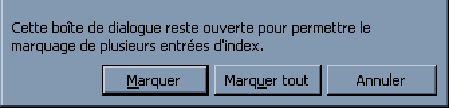 Pour marquer toutes les occurrences de ce texte dans le document, cliquez sur Marquer tout. (Ce bouton n'est disponible que si vous avez préalablement sélectionné le texte avant d'ouvrir la boîte de dialogue - et non si vous avez tapé votre texte dans la boîte de dialogue.) La fonction Marquer tout marque, dans chaque paragraphe, la première occurrence du texte concerné en respectant la casse.