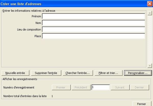 On va créer la liste des personnes à convoquer avec les éléments suivant : nom, prénom, lieu de composition et n° de place. Pour cela on valide saisie d'une nouvelle liste