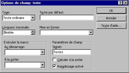 Champ : ce champ permet à l'utilisateur d'entrer du texte, vous pouvez préciser le type de texte autorisé, sa longueur en nombre de caractères, sa mise en forme, le texte proposé par défaut ; on peut nommer votre champ dans la zone ne pas mettre d'espace (les remplacer par _) et certains caractères sont interdits, Word vous avertira si vous faites une erreur. |