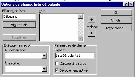 Dans la fenêtre Elément de liste, tapez Débutant, Avancé, Expert en cliquant sur Ajouter après chaque élément. A ce champ, on va associer un texte d'aide qui s'affichera dans la barre d'état. Cliquez sur le bouton Texte d'aide