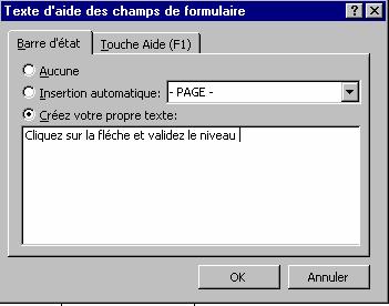 Dans chacune de ces boîtes de dialogue, vous avez le bouton , celui-ci permet de créer une aide pour l'utilisateur du formulaire, une aide qui s'affiche dans la barre d'état. |