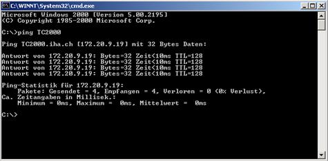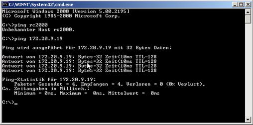 Nach einem Neustart die Namensauflösung im MSDOS mit 'ping TC2000' prüfen