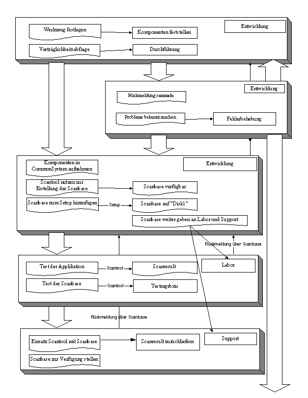 1. Die Entwicklung führt im Rahmen der Einführung neuer Werkzeuge oder Software-Komponenten eine Verträglichkeitsabfrage durch. Falls notwendig werden Fehlerbehebungen geleistet. Danach werden die neuen Komponenten in die gemeinsame Komponentendatenbank CommonSystem aufgenommen.