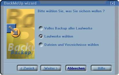 Nachdem Sie die Option Backup ausgewählt haben, können Sie entscheiden, ob Sie ein volles Backup aller Laufwerke oder nur ausgewählter Laufwerke sichern möchten.