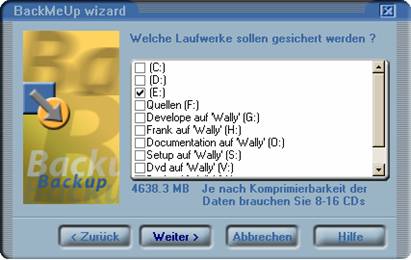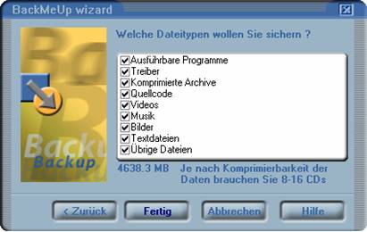 BackMeUp unterstützt die Aufspaltung von Dateien, so daß Sie Ihre Festplatte unabhängig von der Größe auf CD sichern können.
