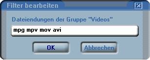 Doppelklicken Sie auf einen Dateityp, wird das Fenster Filter bearbeiten geöffnet. Sie können hier die Endungen bearbeiten. Achten Sie darauf, daß keine Endung doppelt im Filter enthalten ist.