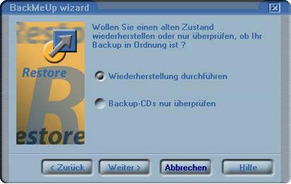 In diesem Fenster können Sie wählen, ob Sie einen alten Datenzustand wiederherstellen möchten, oder ob die aktuelle Backup-CD überprüft werden soll.