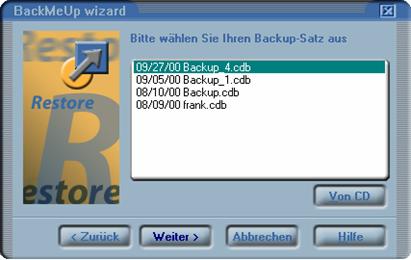 Der Restore-Assistent zeigt Ihnen eine Listen mit den von Ihnen erstellten Backups. Sollte das gewünschte BackUp-Set nicht erscheinen, können Sie auch direkt von der letzten CD der entsprechenden Sicherung die Katalogdatei BackMeUp.cdb einlesen.