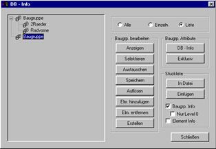 Diese Funktion dient zur Übergabe der DB- Infos von Baugruppen und Elementinfos an Excel. Es können nur Excel 97, Excel 2000 und Excel XP angesteuert werden. Ältere Versionen von Excel sind nicht kompatibel.