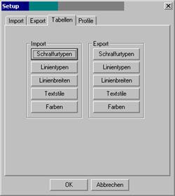 Um eine höchstmögliche Deckungsgleichheit von Original und konvertierter Datei zu erreichen, ist es unumgänglich, dem Konverter gewisse Zuordnungen vorzugeben. Als Beispiel sei stellvertretend die Linientypzuordnung genannt. Während in MegaCAD derzeit 15 durchnummerierte Linientypen gewählt werden können, sind es in AutoCAD beliebig viele, da jeder Linientyp durch einen beliebigen Namen dargestellt werden darf. Es ist leicht einzusehen, das ein Konverter aus dem reinen Namen keine Geometrie ableiten kann. Daher gibt es diese Tabellen.