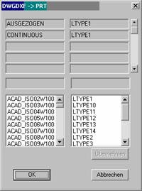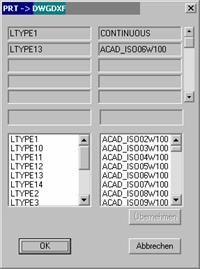 An dieser Stelle wurden alle zum Zeitpunkt der Erstellung bekannten möglichen Elementpaarungen dargestellt. Es kann aber passieren, das in Ihnen geschickten Zeichnungen Elementtypen enthalten sind, die in diesen Tabellen nicht enthalten sind. Dann wird die Option "Attribute anzeigen" unter "Export" oder "Import" wichtig. In dem Moment, wo die Dateien im- oder exportiert werden, wird die Datei analysiert und die derzeitig enthaltenen Linientypen und Textfonts werden dargestellt. Dann können Sie auf die oben beschriebene Art und Wiese Ihre persönliche Tabelle erweitern, denn die im Moment der Konvertierung gemachten Zuweisungen werden dauerhaft zur Liste der Zuordnungen hinzugefügt.