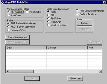 Mit den Optionen des Plotter/Drucker Batchbetrieb sind Zeichnungen in einer Abarbeitungsdatei zusammenstellbar und dann ab einem Stück auf die Ausgabegeräte (z.B. in der Nacht) ausgebbar.