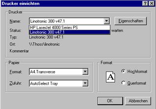 SelDevice-> EPSON FX 80 Papier A4, QuerFormat selektieren.