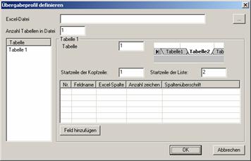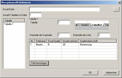 Die Rahmenüberschrift zeigt Ihnen die aktuell gewählte Übergabe-Tabelle an, für die Sie nachfolgend die Definitionen vornehmen werden.