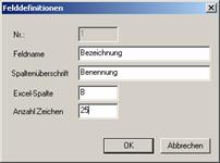 In der Dialogmaske, geben Sie nun den auszuwertenden Feldnamen (ohne Doppelpunkt) ein. Die Spaltenüberschrift darf vom Feldnamen abweichen.