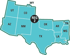 Region 2 - Arizona, Arkansas, Colorado, Louisiana, Mississippi, New Mexico, Oklahoma, Texas, Utah, and (partially) Tennessee and Wyoming