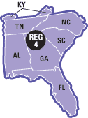 Region 4 - Alabama, Florida, Georgia, South Carolina and (partially) Kentucky, North Carolina, Tennessee, and Virginia